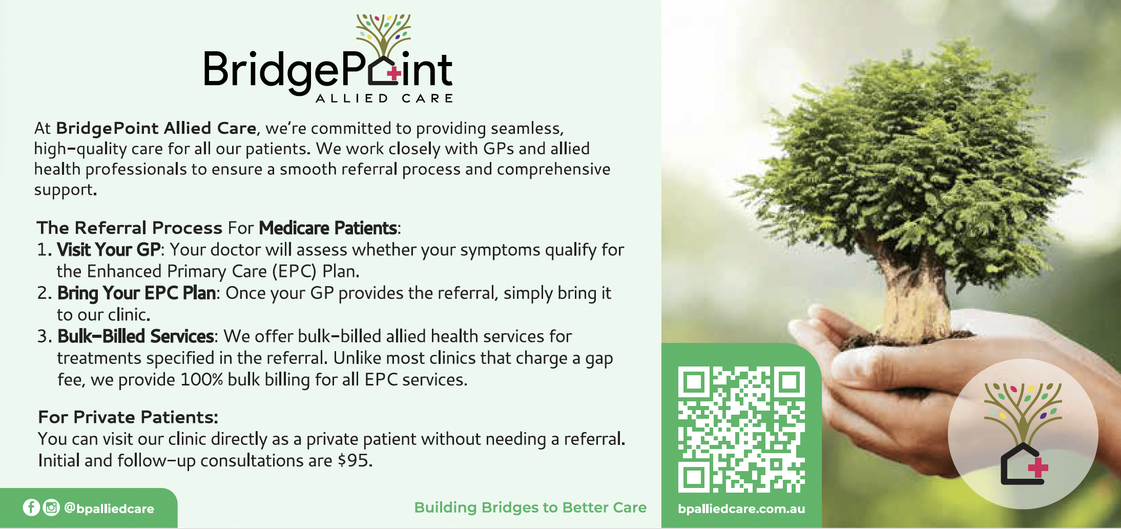 Experience the difference that personalized, compassionate care can make in your health and well-being. Contact BridgePoint today to schedule an appointment or learn more about our bulk-billed physiotherapy and allied health services.